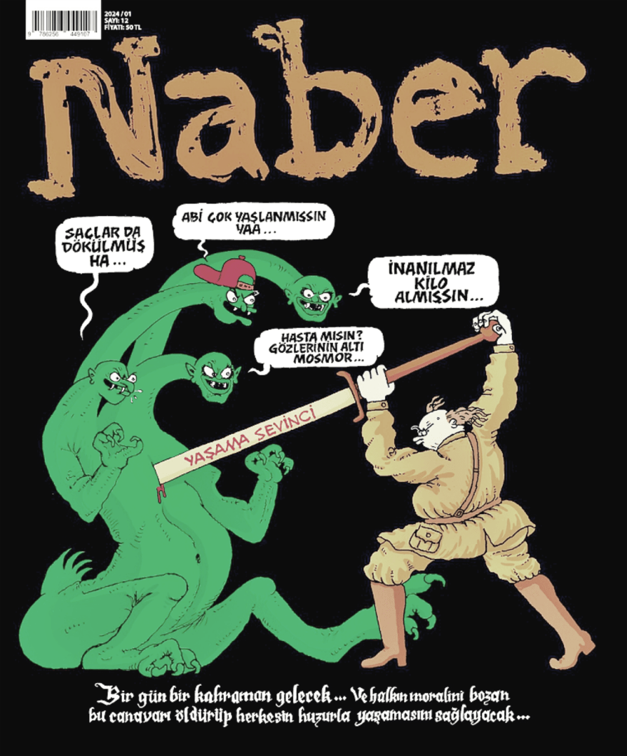 Naber derginin 2024 birinci sayısını henüz satın almadıysam da kapak konusunu ve alt metindeki karakterlere/karaktersizlik örneklerine saldıran sarı üniformalı adamın, zamanında şeriate karşı Atatürk’ün Devrim ve Inkılaplarıyla dibi göstermesini konu eden çizimle özdeşleşir bir şekilde şimdiki zamana taşınmasına yaşarken yazılan tarihin bir parçası olduğundan dolayı bunun benim paylaşımımdan ötede bireysel ya da kişisel algılanmadan evvelinde medya çöplüğüne alet olmayan kara-komediyi okurlara bırakan Umut Sarıkaya ve ekibini de tebrik ederken;