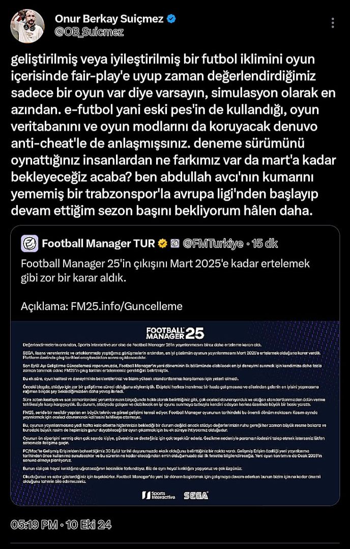 10 Ekim’de Football Manager 2025 oyununu ertelediğinizi duyurduğunuzda Steam platformu üstünden yaklaşık 1200 saat oynadığım FM 2024 oyununu Mart 2025 ayına kadar oynamaya devam etmek zorunda olduğumun bilinciyle şu mesajımı kendi bireysel X (eski Twitter) adresimden paylaşmıştım: