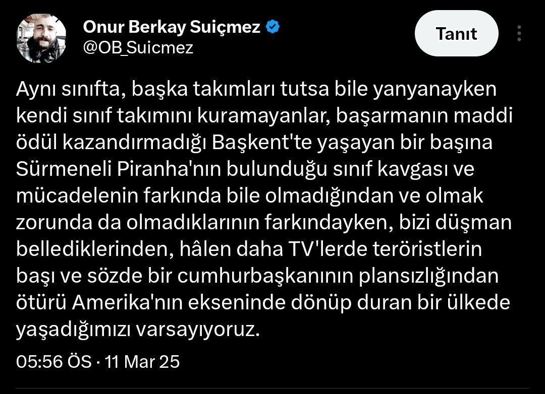 kimse de demiyor ki: İstanbul’u bırakınca Ekrem başkan diyeceğiniz adam ya da Ankara’yı bırakınca Mansur başkan diyeceğiniz adam, iki büyükşehir belediyesini; doğal ışıkla değil ve hatta ampülü de kendileri bulanlardan değil, bulmadan kullananlardan ak-gezenlerin liderine karşı cumhurbaşkanlığına doğru bakış ve seçimde kazanılacak yarış zaten cepte diyip de başkenti ve istanbul’un belediyelerini ak-gezenlere bırakacak kadar düzeysiz mi yaklaşıyoruz? Ben diyorum. azınlık veya çoğunlukla demezseniz de yine adam kazandı derler, yıllar geçip gider de, kaybolan zamanı çalan zaman hırsızlarına karşı sadece saçlar dökülür, ışık gördü mü sararan saçlar koyulaştıkça kendi kendine, ya da, rengi değil kalbi kararan insanların temiz yüzüne hasret kalanlardan eski okul veya tayfalar da kaptan benim kaptanım zamanında “hepimiz birimiz birimiz hepimiz için”, oyun başlangıcı serim, “önümüze gelene bin tekme” düğüm, “ah bir zengin olsam” şarkısını damdaki kemancı filminden değil, “damat halayı” uyarlamasını Türkçe doğru değerlendirmek akıllıca bir çözüm, niye, çünkü, her yerde camii var, ama, inanan, Allah’a zaten dua etmek için cemaatle ya da kalabalıklarla kalabalıkların halısına eğilmek zorunda kalmayandır.