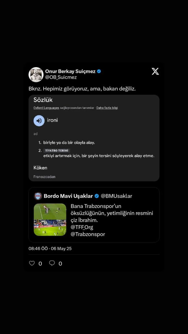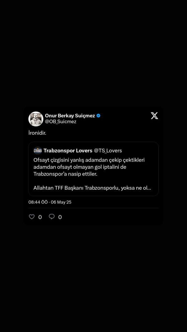Ben Trabzon’luyum, Trabzonspor’luyum. Ankara’da yaşıyorum. Amanini mor koyun “m’eeeler” gelirci düdükleri atayan külliyeyle de herhangi bir temasım ya da bağlantım yok.
