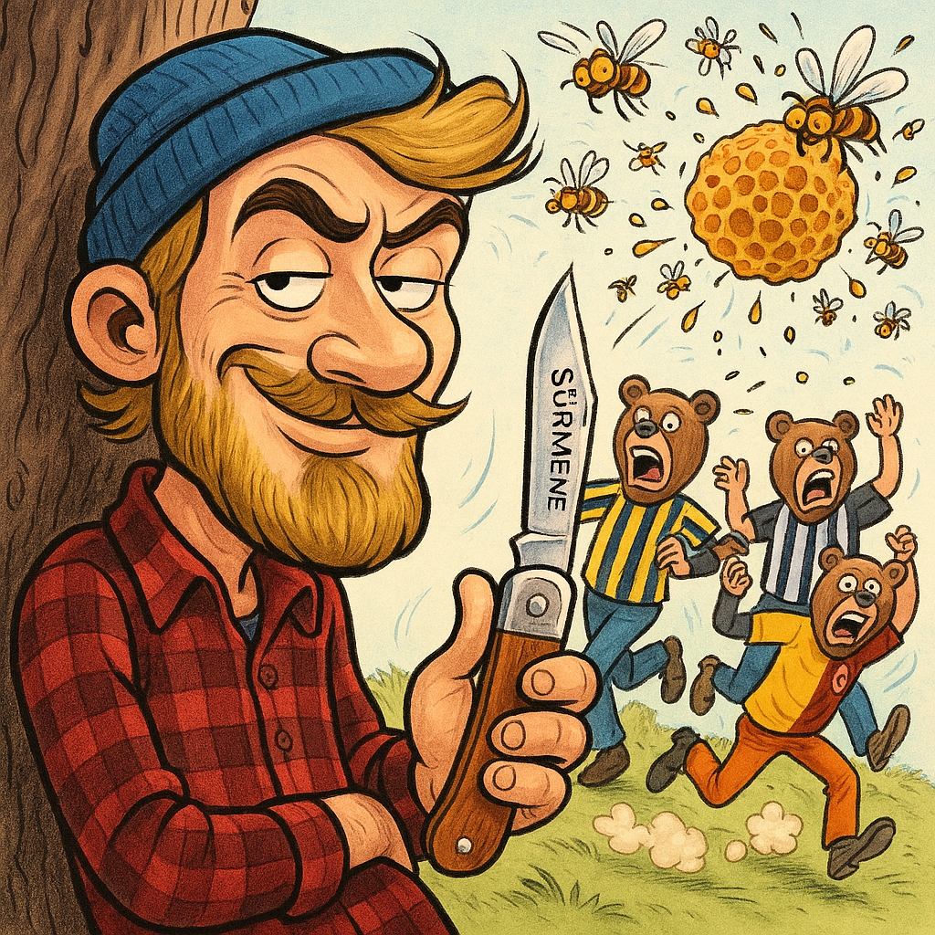öncelikle bizum karadenizli temel; başında beresi, sivri burnuyla ana figürümüz. devam edelim… temel, yorulmuş ve bir ağaca sırtını yaslamış dinlenmekteymiş. karşısına biri fener, diğeri beşiktaş, öbürü de galatasaray formalı ama kafalarında ayı maskesi takılı 3 adam görmüş. temel ne yapsa beğenirsiniz, belinden sürmene çakısını almış ve ağacın yükseklerinde duran bal peteğini kovanıyla indirmiş ayı maskeli üç istanbul takımının forması giyen adamın başına. ayı maskeli adamlar da arılardan korkup kaçmışlar. kaçmışlar; ama, temel durur mu hiç, yapıştırmış kafadan yanıtını, ayı olup arıdan kaçmayı biliyisinuz da, adam olan bizim dağa ha boyle çırılçıplak gelmez.