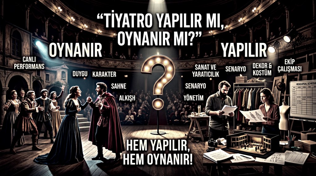 Dolayısıyla “tiyatro yapılır” ifadesi, tiyatro sanatının üretim sürecini; “tiyatro oynanır” ifadesi ise sahne üzerindeki icrayı anlatır. İkisi birbirini dışlamaz, aksine tamamlar. Bir oyunun seyirciye ulaşabilmesi için önce yapılması, sonra oynanması gerekir. Bu ayrım, dildeki inceliği ve tiyatronun hem kolektif üretim hem de bireysel performans boyutunu gösterir.